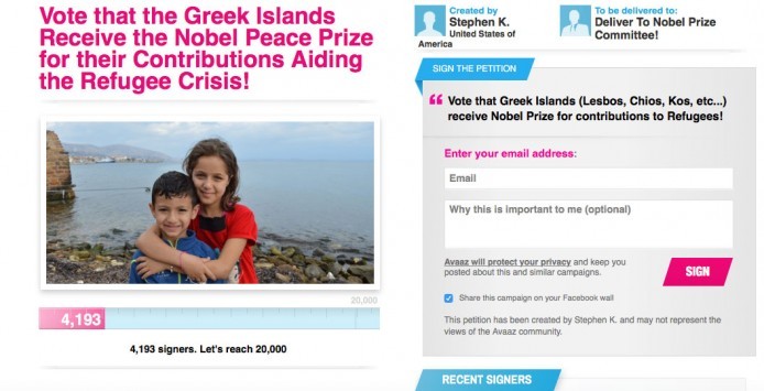 Υπογραφές για απονεμηθεί το Νόμπελ Ειρήνης στους Έλληνες νησιώτες που άνοιξαν τις αγκαλιές και τα σπίτια τους για να βοηθήσουν τους χιλιάδες πρόσφυγες μαζεύουν ακτιβιστές. Η διαδικτυακή καμπάνια για το Νόμπελ Ειρήνης στα ελληνικά νησιά έχει συγκεντρώσει ήδη περισσότερες από 4.000 υπογραφές.Η ψηφοφορία γίνεται μέσω της ιστοσελίδας avaaz.org, όπου ο καθένας μπορεί να μπει και να "υπογράψει" την αίτηση για να δοθεί το Νόμπελ Ειρήνης στους κατοίκους των ελληνικών νησιών που έχουν ανταποκριθεί με συγκλονιστικό τρόπο στην προσφυγική κρίση, την ώρα που η Ευρώπη και οι ηγέτες της κάνουν τα στραβά μάτια με ημίμετρα.«Οι κάτοικοι των ελληνικών νησιών στο Αιγαίο Πέλαγος (και πολλοί άλλοι εξωτερικοί, παγκόσμιοι, μη κερδοσκοπικοί οργανισμοί και Έλληνες της διασποράς) έχουν κάνει και κάνουν ό,τι είναι δυνατόν για να βοηθήσουν τους εκτοπισμένους Σύρους πρόσφυγες και τους κάνουν να αισθανθούν όσο πιο άνετα γίνεται, παρότι έχουν κι εκείνοι πολύ λίγα να προσφέρουν, παρόλο που βρίσκονται σε σοβαρή οικονομική κρίση εδώ και πολλά χρόνια. Έχουν δείξει την χριστιανική τους συμπεριφορά με πράξεις φιλότιμου, αγάπης, σεβασμού και φιλοξενίας σε εκείνους που τους είναι εντελώς άγνωστοι. Οι πράξεις τους και οι θυσίες τους δεν θα περάσουν απαρατήρητες γιατί συμβάλλουν σημαντικά στην παγκόσμια ειρήνη και σταθερότητα, και αποτελούν ξεκάθαρα παραδείγματα ΑΓΑΠΗΣ για όλο τον κόσμο, για να χρησιμοποιηθούν και να μάθουν από αυτά!».